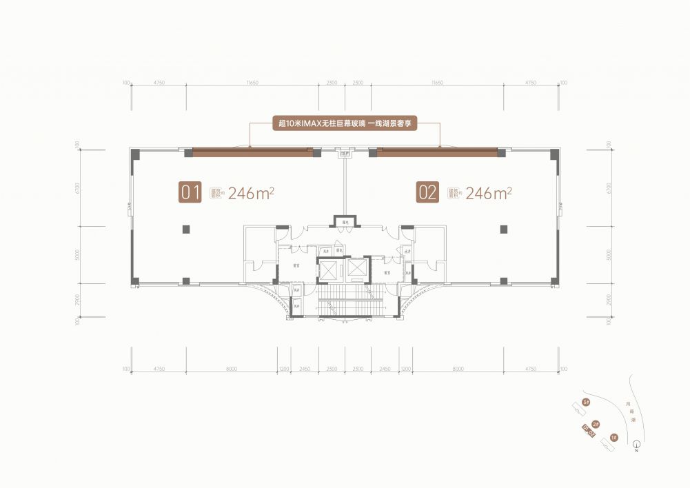 两梯两户,赠送超大入户前室约 20 ㎡,3.5 米层高,享受大平层应有的豪华舒适感。 超 10 米落地玻璃,户内基本无柱,墙体可灵活拆改打造灵动大空间,根据自己的需求定制湖景大平层。